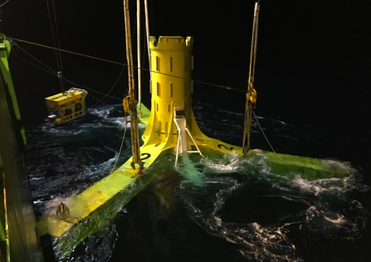 Installing a tidal stream turbine base at the MeyGen project off the coast of Caithness in northeast Scotland.